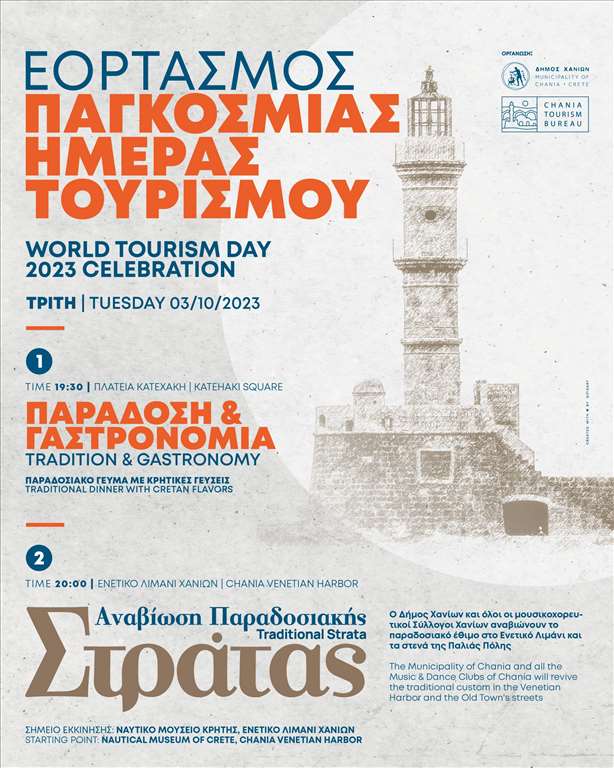 Ο Δήμος Χανίων, με αφορμή την Παγκόσμια Ημέρα Τουρισμού 2023, διοργανώνει το απόγευμα της Τρίτης 3 Οκτωβρίου 2023 (εξ’ αναβολής από την προηγούμενη εβδομάδα) μία σειρά από δράσεις με επίκεντρο το Ενετικό λιμάνι της πόλης.