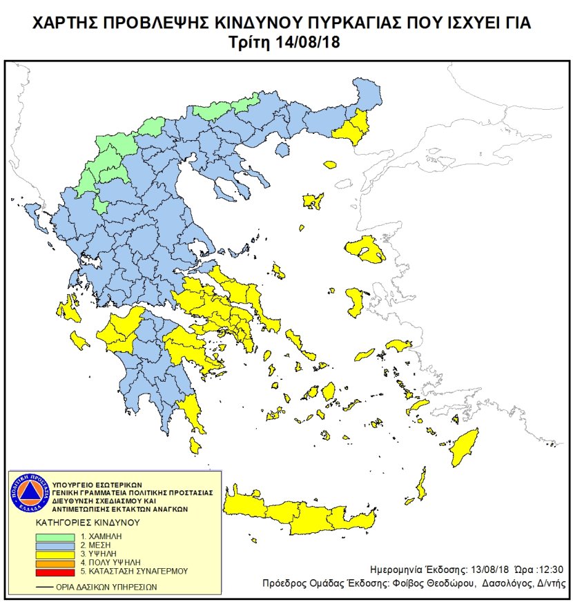 Υψηλός κίνδυνος πυρκαγιάς (κατηγορία κινδύνου 3) για σήμερα Τρίτη, 14 Αυγούστου σύμφωνα με το χάρτη πρόβλεψης κινδύνου που εκδίδει η Γενική Γραμματεία Πολιτικής Προστασίας.