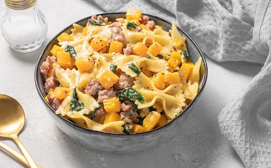 Ζυμαρικά με λουκάνικο, σπανάκι και κίτρινη κολοκύθα